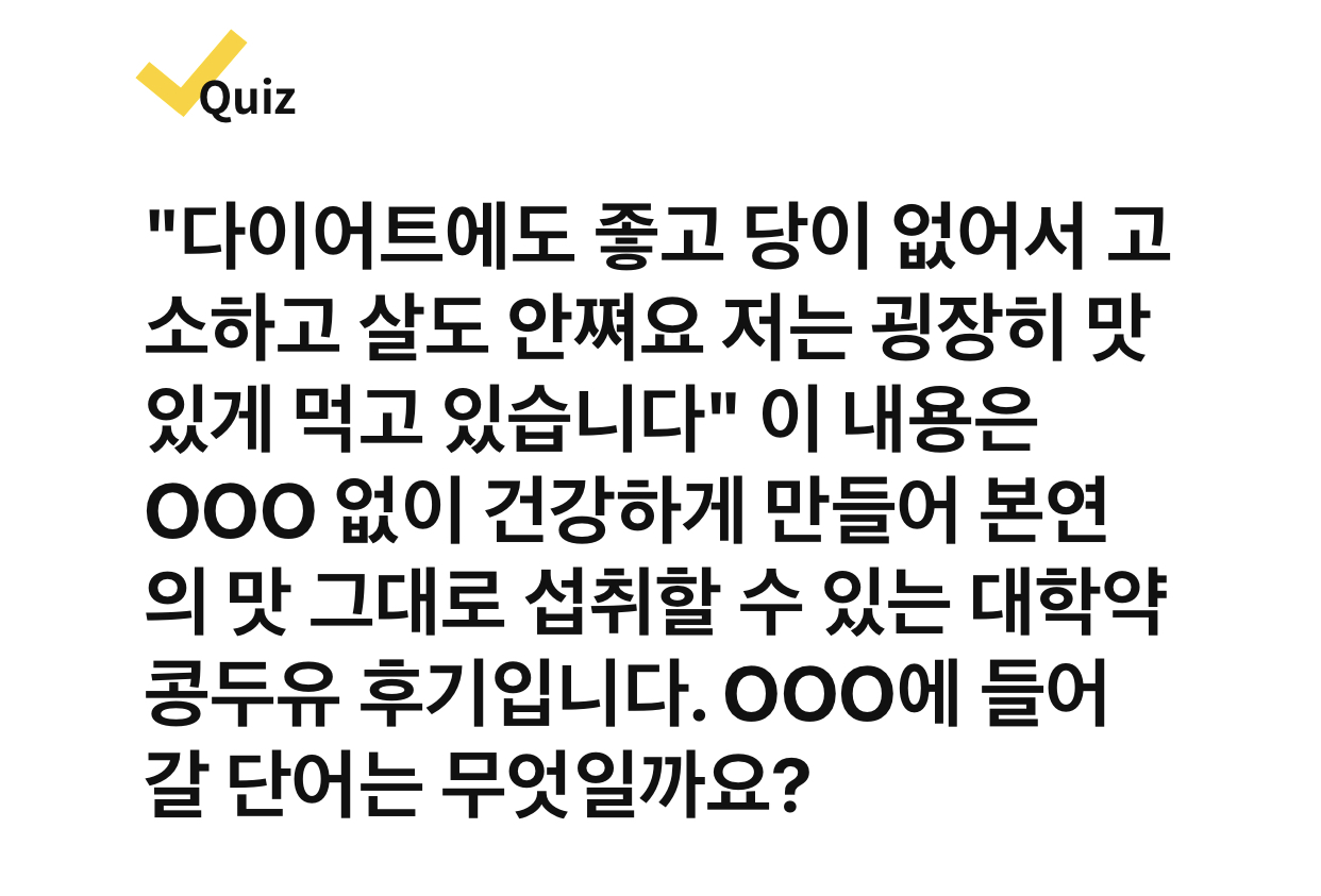 "다이어트에도 좋고 당이 없어서 고소하고 살도 안쪄요 저는 굉장히 맛있게 먹고 있습니다" 이 내용은 OOO 없이 건강하게 만들어 본연의 맛 그대로 섭취할 수 있는 대학약콩두유 후기입니다. OOO에 들어갈 단어는 무엇일까요?