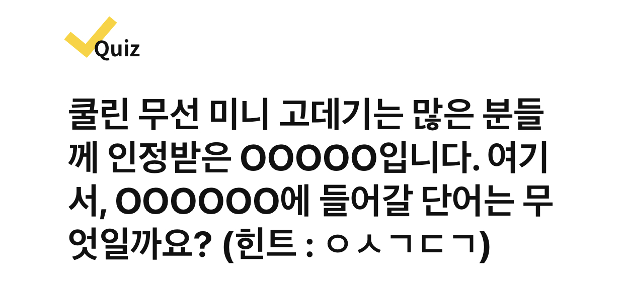 쿨린 무선 미니 고데기는 많은 분들께 인정받은 OOOOO입니다. 여기서, OOOOOO에 들어갈 단어는 무엇일까요? (힌트 : ㅇㅅㄱㄷㄱ)