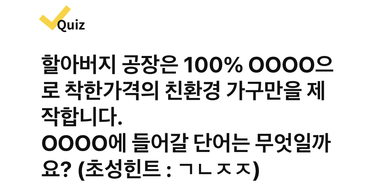 할아버지 공장은 100% OOOO으로 착한가격의 친환경 가구만을 제작합니다.