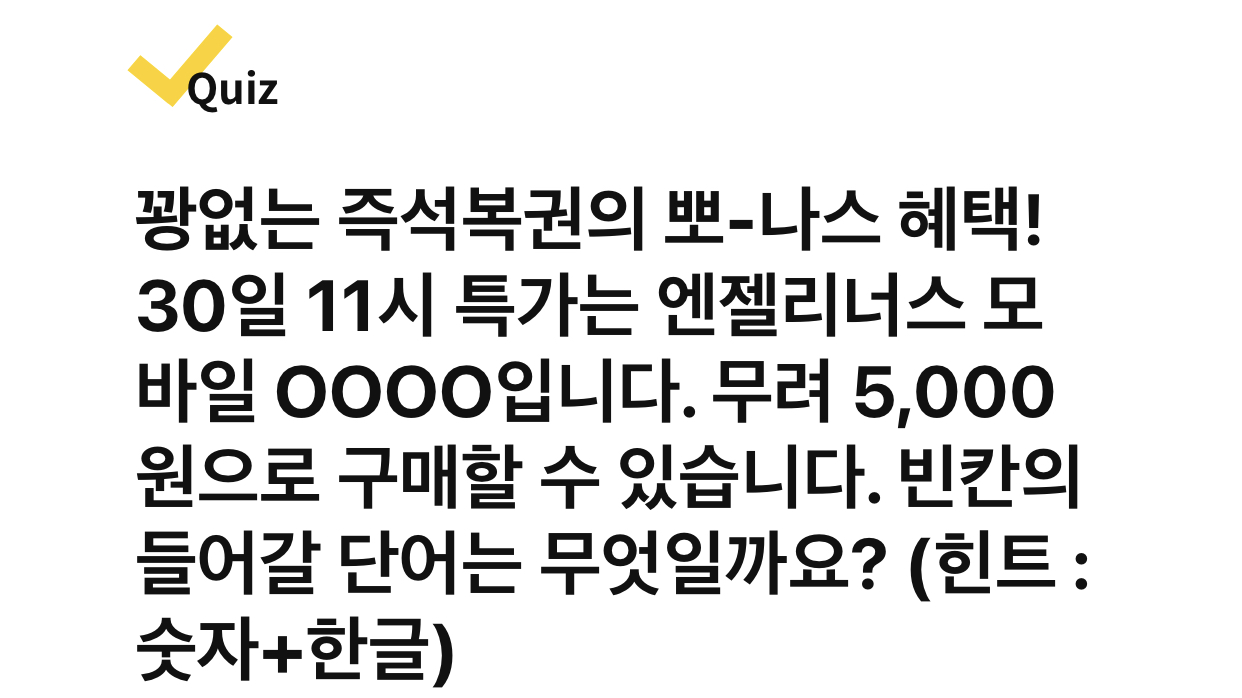 꽝없는 즉석복권의 뽀-나스 혜택! 30일 11시 특가는 엔젤리너스 모바일 OOOO입니다. 무려 5,000원으로 구매할 수 있습니다. 빈칸의 들어갈 단어는 무엇일까요? (힌트 : 숫자+한글)
