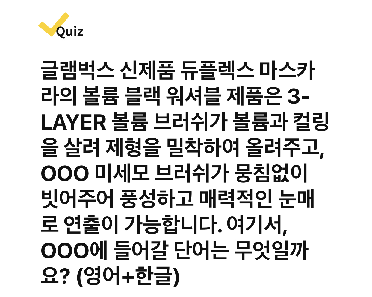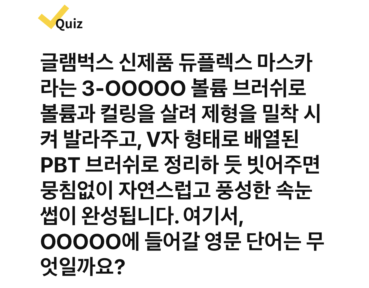 글램벅스 신제품 듀플렉스 마스카라의 불륨 블랙 워셔블 제품은 3-LAYER 볼륨 브러쉬가 볼륨과 컬링을 살려 제형을 밀착하여 올려주고 ㅇㅇㅇ 미세모 브러쉬가 뭉침없이 빚어주어 풍성하고 매력적인 눈매로 연출이 가능하다. ㅇㅇㅇ에 들어갈 단어는? 힌트 : 영어+한글