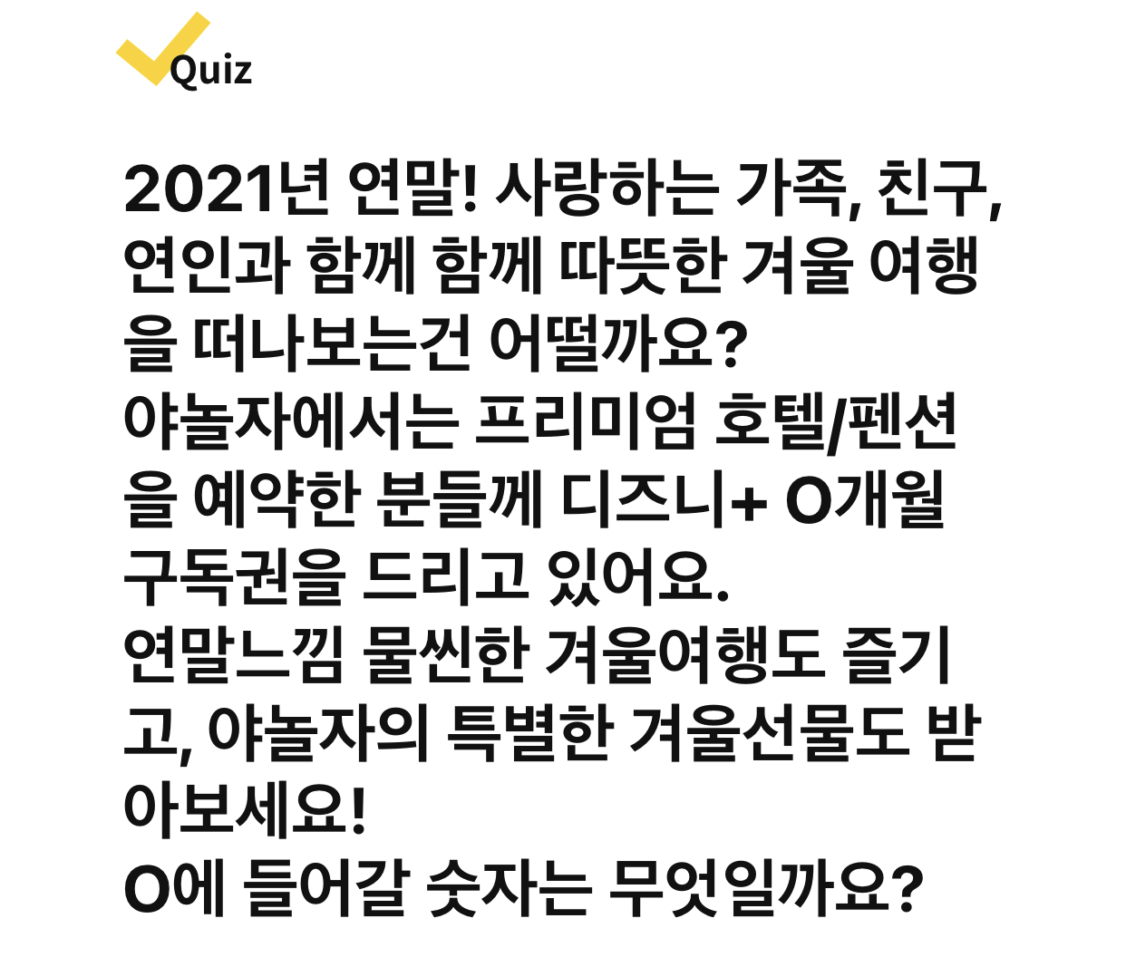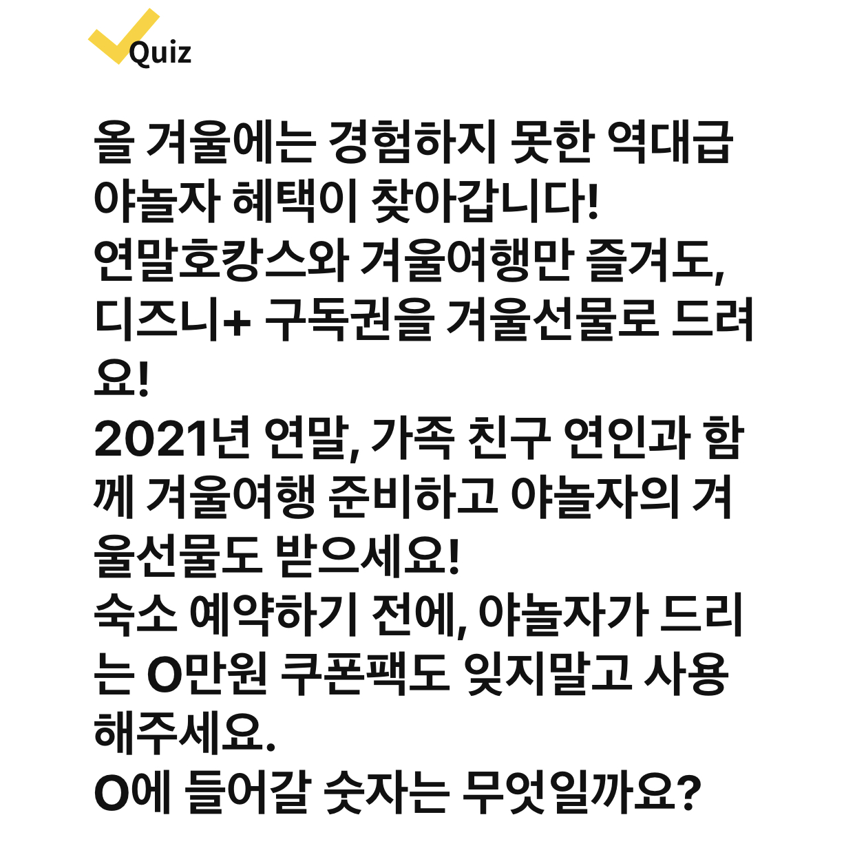올 겨울에는 경험하지 못한 역대급 야놀자 혜택이 찾아갑니다! 연말호캉스와 겨울여행만 즐겨 도, 디즈니 + 구독권을 겨울선물로 드려요! 2021년 연말, 가족 친구 연인과 함께 겨울여행 준비하고 야놀자의 겨울선물도 받으세요! 숙소 예약하기 전에, 야놀자가 드리는 0만원 쿠폰팩도 잊지말고 사용해주세요. 0에 들어갈 숫자는 무엇일까요?