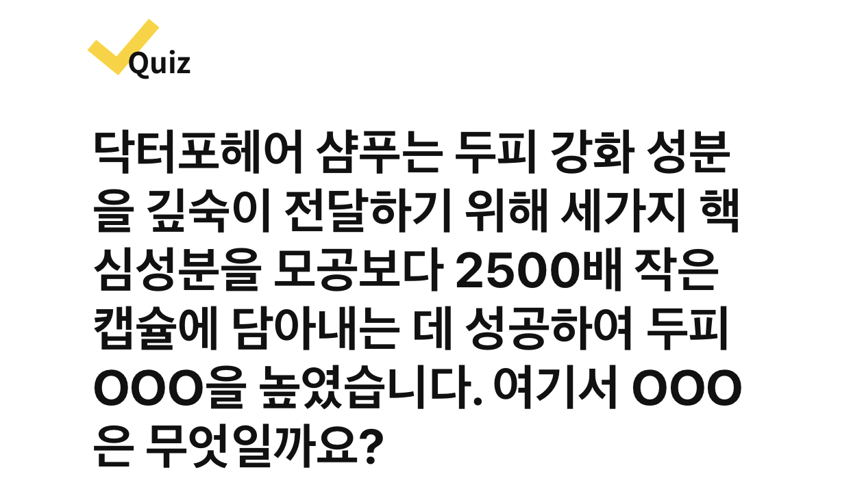 닥터포헤어 샴푸는 두피 강화 성분을 깊숙이 전달하기 위해 세가지 핵심성분을 모공보다 2500배 작은 캡슐에 담아내는 데 성공하여 두피 OOO을 높였습니다. 여기서 OOO은 무엇일까요?