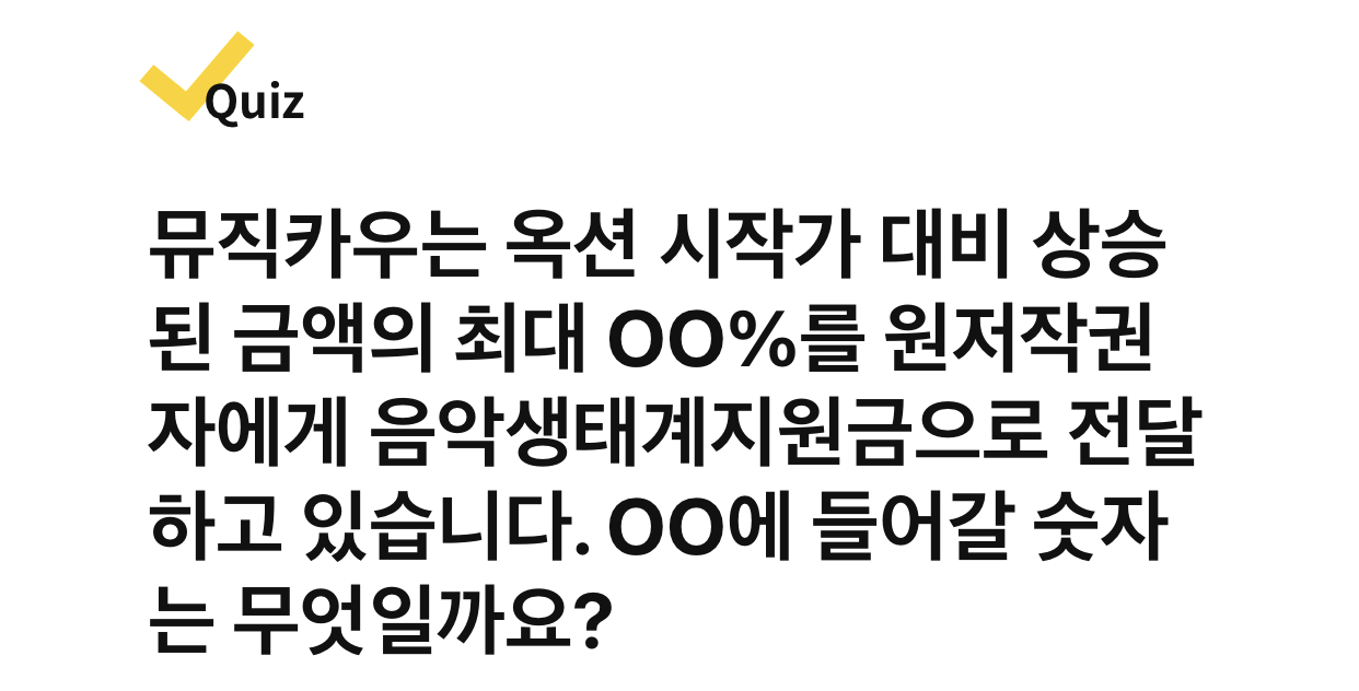 뮤직카우는 옥션 시작가 대비 상승된 금액의 최대 OO%를 원저작권자에게 음악생태계지원금으로 전달하고 있습니다. OO에 들어갈 숫자는 무엇일까요?