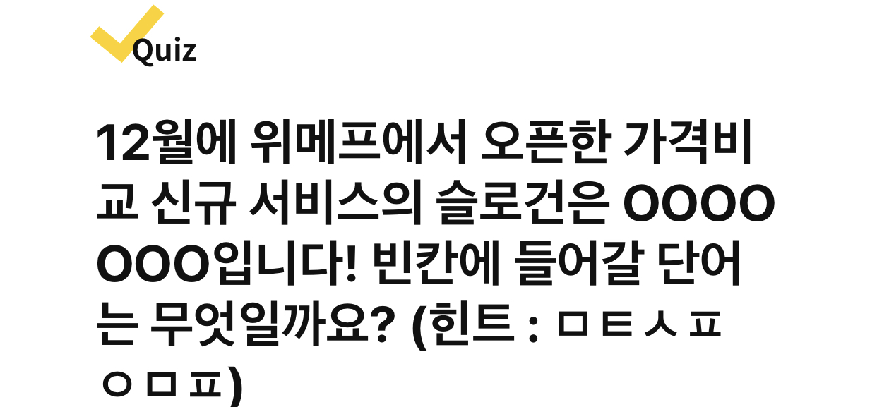 12월에 위메프에서 오픈한 가격비교 신규 서비스의 슬로건은 OOOO OOO입니다! 빈칸에 들어갈 단어는 무엇일까요? (힌트 : ㅁㅌㅅㅍ ㅇㅁㅍ)