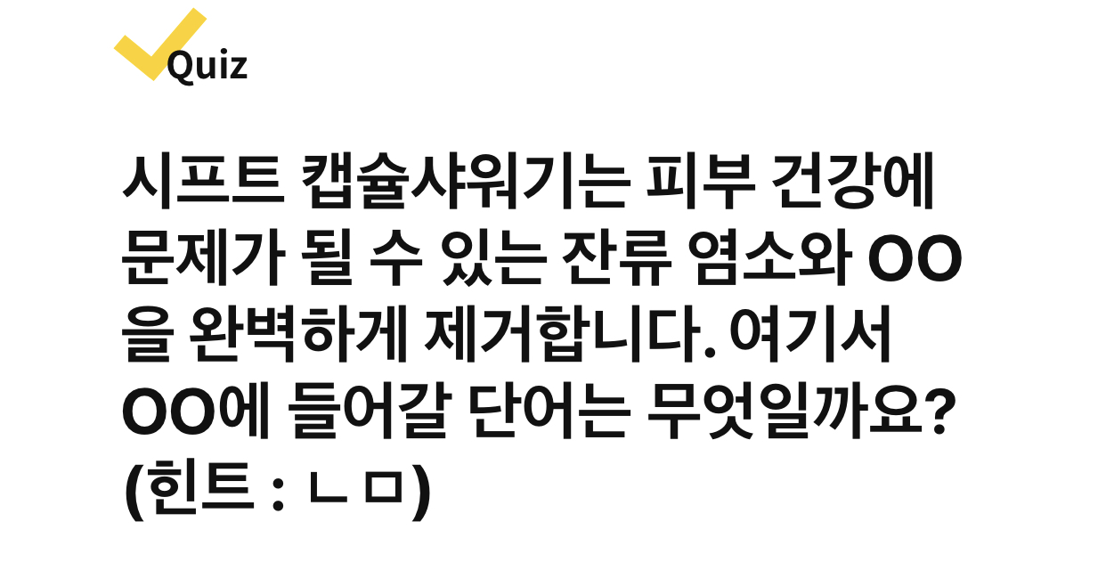시프트 캡슐샤워기는 피부 건강에 문제가 될 수 있는 잔류 염소와 ○○을 완벽하게 제거합니다. 여기서 ○○에 들어갈 단어는 무엇일까요?