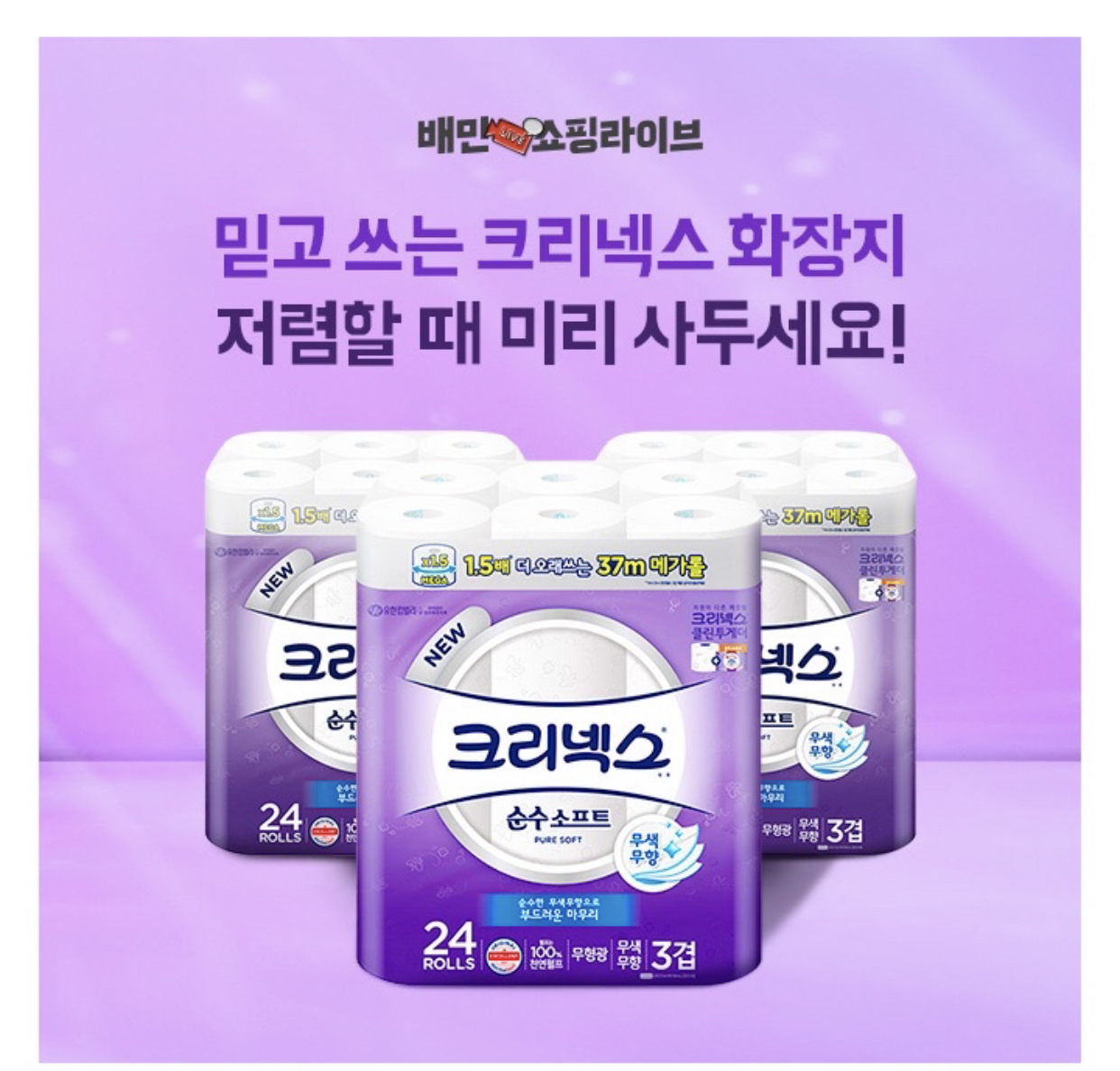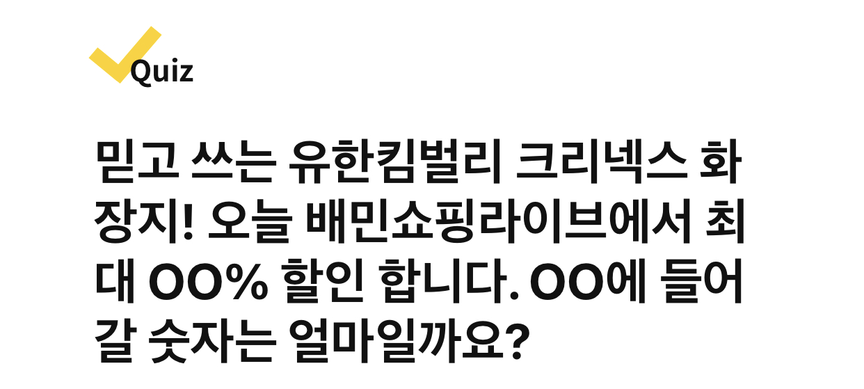 믿고 쓰는 유한킴벌리 크리넥스 화장지! 오늘 배민쇼핑라이브에서 최대 OO% 할인 합니다. OO에 들어갈 숫자는 얼마일까요?