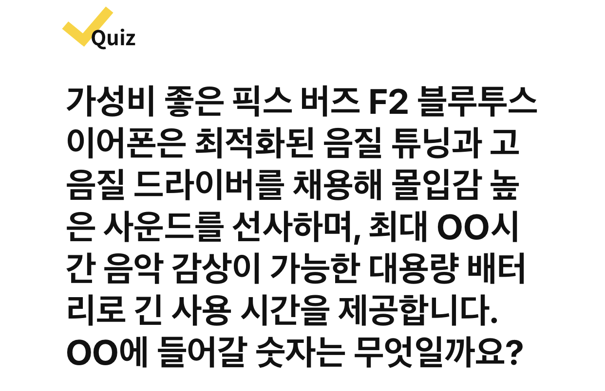 가성비 좋은 픽스 버즈 F2 블루투스 이어폰은 최적화된 음질 튜닝과 고음질 드라이버를 채용해 몰입감 높은 사운드를 선사하며, 최대 OO시간 음악 감상이 가능한 대용량 배터리로 긴 사용 시간을 제공합니다. OO에 들어갈 숫자는 무엇일까요?