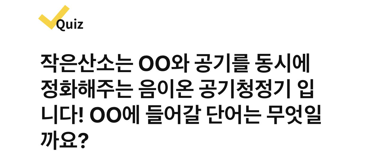 작은산소는 OO와 공기를 동시에 정화해주는 음이온 공기청정기 입니다! OO에 들어갈 단어는 무엇일까요?