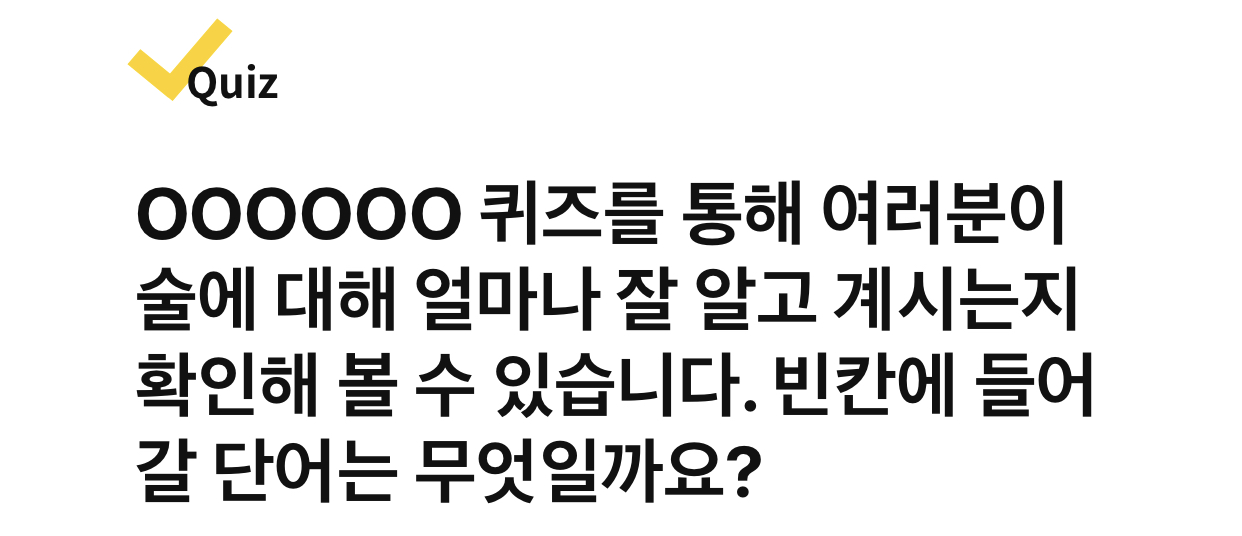 OOOOOO 퀴즈를 통해 여러분이 술에 대해 얼마나 잘 알고 계시는지 확인해 볼 수 있습니다. 빈칸에 들어갈 단어는 무엇일까요?