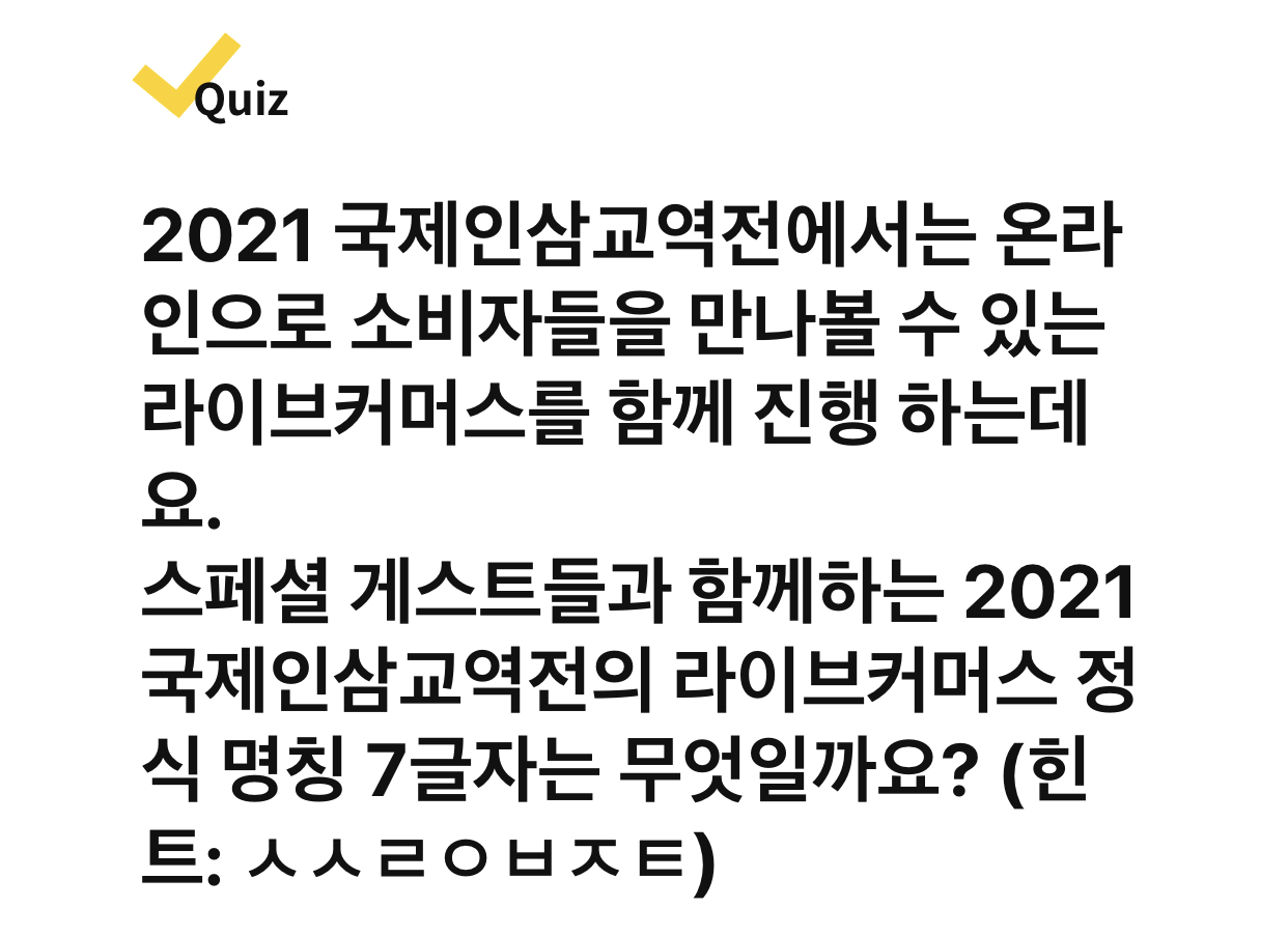스페셜 게스트들과 함께하는 2021국제인삼교역전의 라이브커머스 정식 명칭 7글자는 무엇일까요? (힌트: ㅅㅅㄹㅇㅂㅈㅌ)