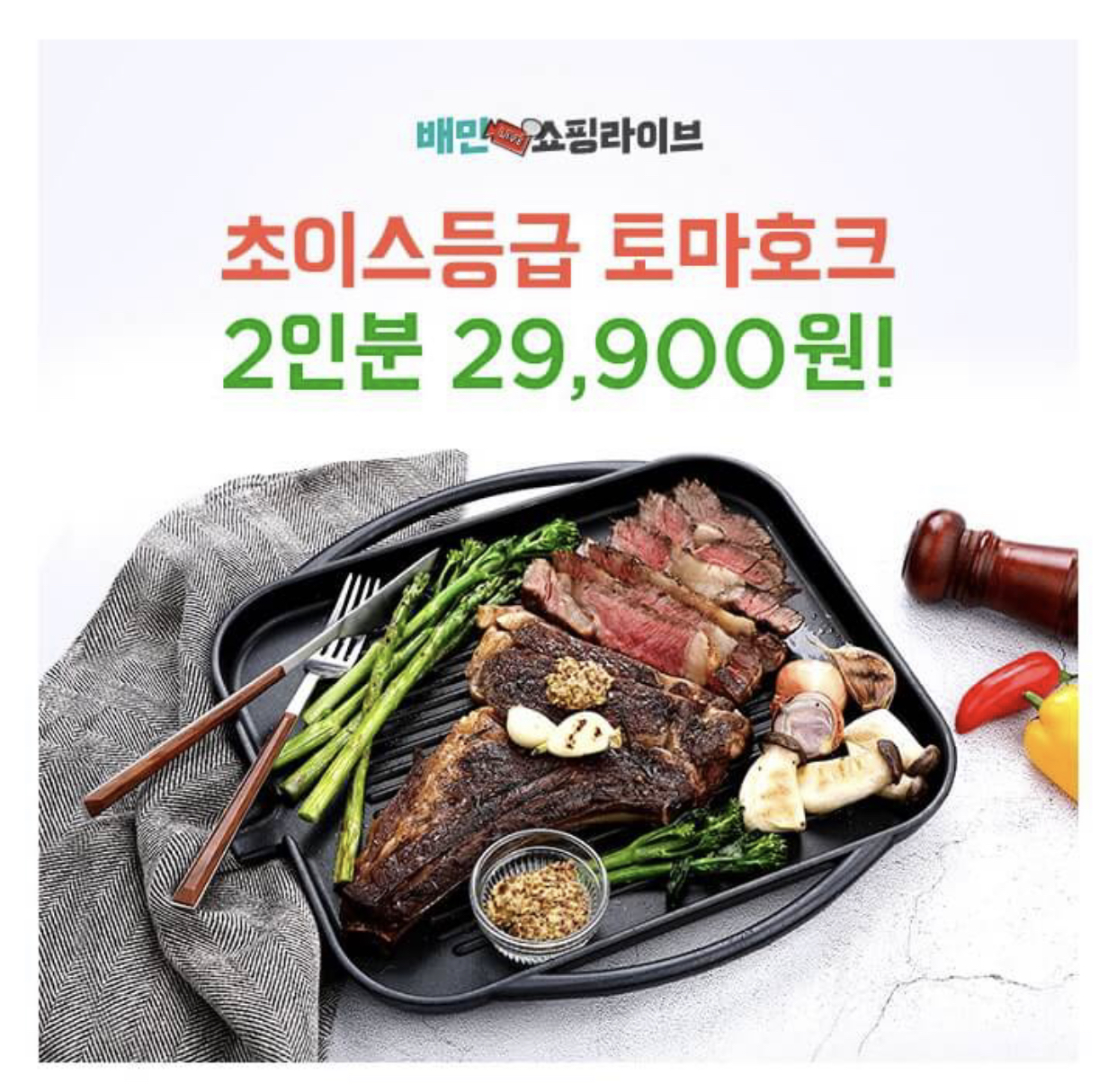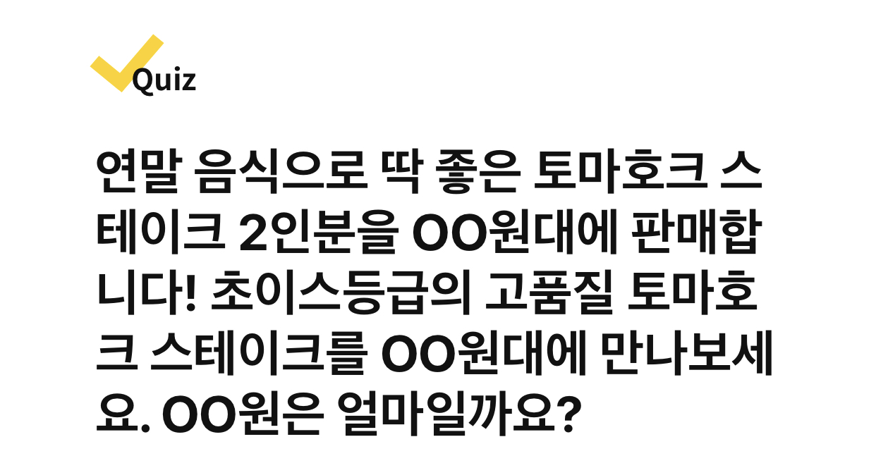 연말 음식으로 딱 좋은 토마호크 스테이크 2인분을 OO원대에 판매합니다! 초이스등급의 고품질 토마호크 스테이크를 OO원대에 만나보세요. OO원은 얼마일까요?