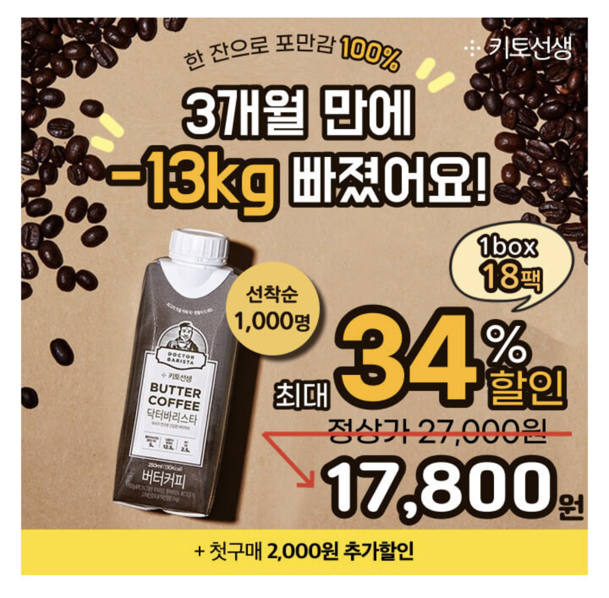 "운동도 못하고 저녁엔 매일 술자리였어요. 대신 아침에 닥터바리스타 하나씩 마셨는데 2주동안 5kg 빠졌어요! 너무 신기하고 기쁘네요ㅠ" 이 후기는 지방을 에너지로 바꾸는 'OOO'MCT오일 2.5g이 함유된 닥터바리스타 방탄커피 구매자의 후기입니다.